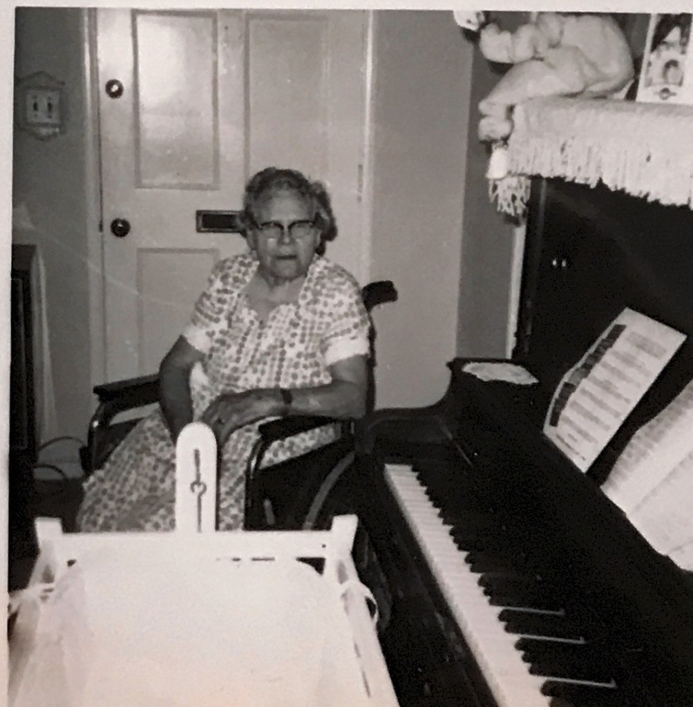 Verona acquired the nickname “Gee Gee” (hard G) from one of my cousins trying to say Grandma. As a result, all her great grandchildrens kids called her Gee Gee. She was the first person I knew in a wheelchair, as she had been crippled by a broken hip after falling in the bathtub. She had the first color TV in the family and I remember when we all went to her house to watch the Rose Parade on TV in color! She was the first person I knew with a piano in the house. It was fun to tap the keys trying to find a melody…. until the parents couldn’t take it anymore and had us play with something else.
