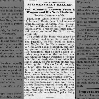 When I expanded my newspaper microfilm search, which meant actually reading the paper looking for the name Banta, I found a story of a man named James Banta, age 48, who died in a wagon accident. He had literally fallen off his wagon to his death. I did not think this could be my James Banta due to his age and the timing of the accident. This accident happened four days before Belle was born! The mystery was clouded further as the newspaper article did not name his widow or his children, but simply stated he left a widow and large family, see the article below.